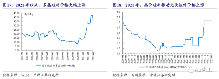 抑制光伏装机需求的因素正在消散。根据Wind数据,2021年以来,国产多晶硅料年初价格为13.15美元/kg,12月最高上涨至42.70美元/kg,涨幅高达224.71%。2021年以来,随着光伏装机需求增长,硅料供给捉襟见肘。同时在能耗双控政策的严控下,金属硅供应水平大幅下降,价格大幅上涨,带动原已高价的硅料进一步走高,下游光伏组件、装机成本大幅提高。2021年10月以来,国家发改委对限电现象进一步纠偏,根据财联社报道,国家发展改革委等部门发布关于严格能效约束推动重点领域节能降碳的若干意见,进一步提出:要避免“一刀切”管理和“运动式”减碳,确保产业链供应链安全和经济社会平稳运行。同时,2021年Q4,通威股份、新特能源、大全新能源等新增硅料产能投产,硅料供给瓶颈大幅缓解,硅料价格自12月初上涨至高点后开始逐渐下跌。当前光伏产业链尚处于上下游博弈阶段,但随着金属硅价格高位回落、多晶硅新增产能投放,硅料价格有望持续回落。待光伏产业链上下游博弈到新的平衡点时,我们坚定看好光伏装机需求有望超预期增长,带动光伏玻璃需求增长。