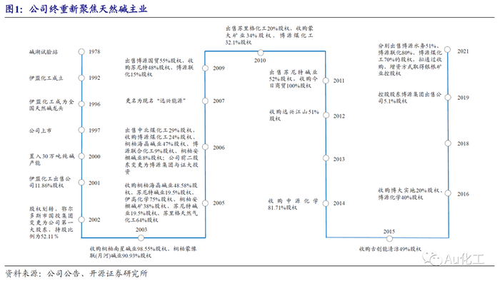 创业过程筚路蓝缕,公司终回天然碱主业。公司原名“天然碱”,于1997年1月31日于深交所上市。上市以来,公司紧紧把握国家宏观经济政策和产业导向,以“产业升级、转型发展”为重点,致力于打造循环经济特征鲜明的化工、能源及煤化工产业基地。在碳达峰、碳中和的大背景下,以及公司控股股东博源集团发现国内新的大型天然碱矿,公司终逐步剥离低效资产,进一步聚焦天然碱主业。我们将公司发展经营历史分为三部分:(1)1997-2001年:公司天然碱主业成雏形。公司前身为伊盟化学工业总公司。1996年,伊盟化工通过一系列并购,控制了国内95%以上的天然碱资源。2000年,公司通过产能置换,置入20万吨重质纯碱产能、10万吨小苏打及烧碱产能,公司天然碱产能呈雏形。(2)2002-2016年:二次创业,多元化布局煤炭、能源化工产业。2001年,公司正式确立了“巩固天然碱、发展天然气、进入高科技”的发展战略,并于2007年更名为“远兴能源”。2002-2016年,公司通过并购、融资等多种方式,参股、收购、建设甲醇、尿素、煤炭等能源化工产能,逐渐形成以天然碱化工为基础、能源化工为主导的产业布局。(3)2017-2021年:剥离煤炭及能源化工资产,回归公司主营天然碱。公司子公司银根矿业发现新的大型天然碱矿,在双碳的大背景下,未来公司将逐步出清煤炭、能源化工等产能,聚焦天然碱主业,建设天然碱新产能。