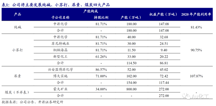 公司目前为国内最大的天然碱企业,将建设860万吨天然碱项目。目前公司正在逐步着手剥离低效资产,未来公司将聚焦发展天然碱主业,辅以少量煤炭、尿素业务。待资产剥离完毕后,公司将拥有纯碱年产能180.00万吨,权益产能147.08万吨;小苏打年产能114.50万吨,权益产能86.81万吨;拥有尿素年产能为154.00万吨,权益产能117.44万吨;参股煤炭公司蒙大矿业(权益34%),拥有煤炭权益产能272.00万吨(不并表)。公司控股子公司中源化学(权益81.71%)为目前国内唯一的在产天然碱法制纯碱企业,位于河南省南阳市。公司子公司银根矿业于内蒙古阿拉善盟发现新的大型天然碱矿,立足于该大型天然碱矿,银根矿业未来将建设780万吨纯碱与80万吨小苏打大型天然碱项目。未来公司将通过收购股权、增资等方式,将银根矿业的持股比例提高至60%,实现对银根矿业的控股,主导该天然碱项目建设。