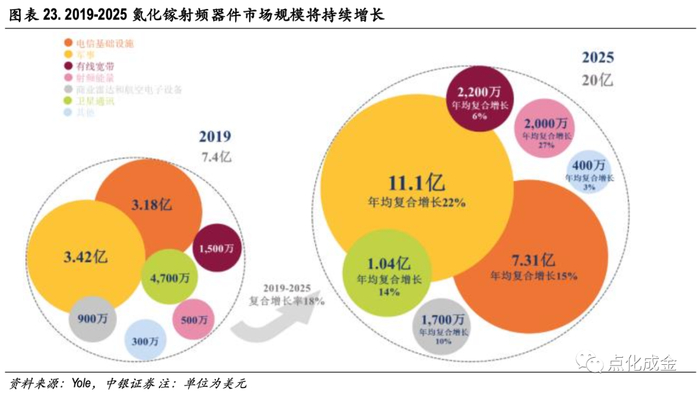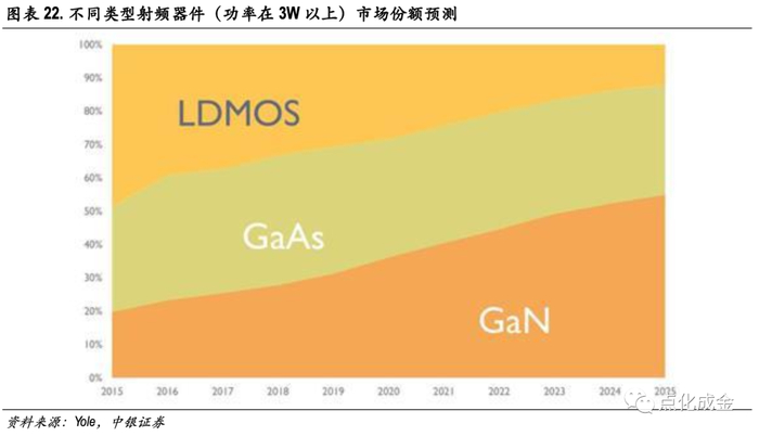 氮化镓射频器件正在取代LDMOS在通信宏基站、雷达及其他宽带领域的应用。随着信息技术产业对数据流量、更高工作频率和带宽等需求的不断增长,氮化镓器件在基站中应用越来越广泛。根据Yole预测,至2025年,功率在3W以上的射频器件市场中,砷化镓器件市场份额基本维持不变的情况下,氮化镓射频器件有望替代大部分硅基LDMOS份额,占据射频器件市场约50%的份额。
