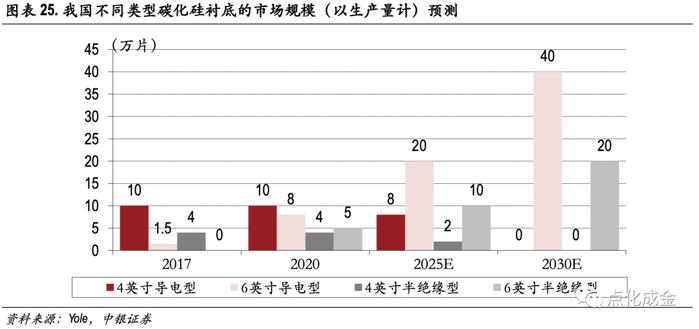 大尺寸衬底单位面积能够生产的芯片更多,衬底的大尺寸化是未来趋势。根据Yole数据,2020年全球4英寸半绝缘型碳化硅衬底的市场收入占比为85%,但预计6英寸半绝缘型衬底的市场收入占比将逐年递增,到2023年或达55%。导电型衬底市场规模增速将远超半绝缘型衬底,预计2030年我国6英寸导电型衬底的生产量能达到40万片,是6英寸半绝缘型衬底的两倍。