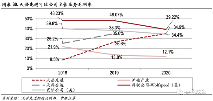 公司成长迅速,有望在与国际巨头的竞争中后来居上。2020年公司在半绝缘型衬底的全球市场份额已达30%。但从营收规模看,国际碳化硅衬底巨头科锐公司下属Wolfspeed公司2020年营收折合人民币约为30.38亿元,公司同期营收为4.25亿元,上升空间仍然十分明显。得益于生产设备国产化推进,产能扩张,规模效应显现,公司盈利能力稳步提升。公司主营业务毛利率从2018年的8.5%大幅提升至2020年的34.9%,逐渐接近国际主要竞争者。公司与全球行业龙头企业相比,同尺寸产品在技术参数上不存在明显差距;且4英寸产品已经量产,与全球行业龙头企业相比差距较小;但在各尺寸量产时间、大尺寸产品供应情况及供应链配套等方面仍与全球龙头企业存在一定差距。