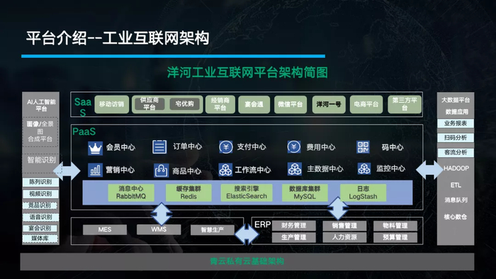上图是洋河基于青云基础架构构建的工业互联网平台。在底层,青云私有云提供基础服务,上层通过 MES、WMS、智慧生产与 ERP 提供基础数据,在 PaaS 层构建了会员中心、码中心、工作流、订单中心、主数据中心以及商品中心等十大中心。在 SaaS 层,洋河对消费者、上下游合作伙伴和内外部员工提供 GR 平台、供应商平台、智能运营管控平台、洋河一号、第三方接入平台、电商平台、宅优购和宴会通等。同时,洋河还在探索 AI 人工智能和大数据分析平台。