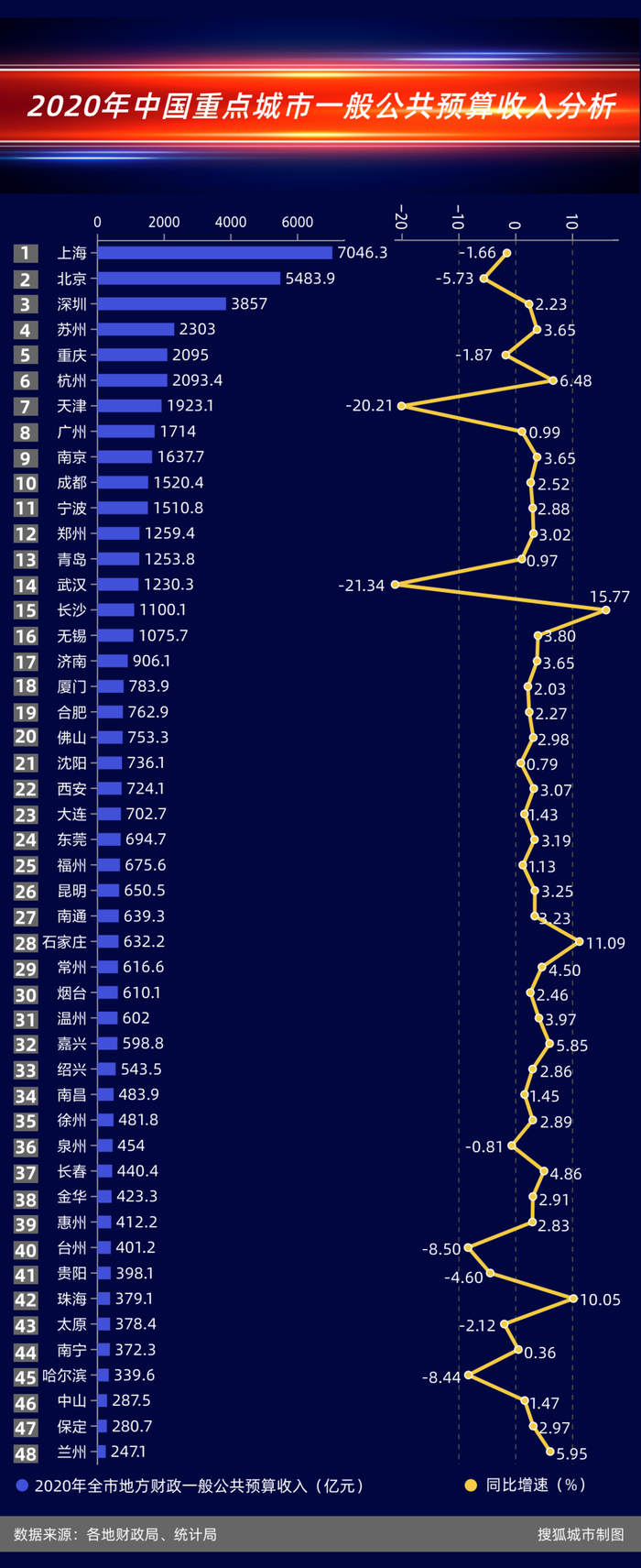 2020年,在全国300多个地市中,仅有16市一般公共预算收入超过1000亿元。