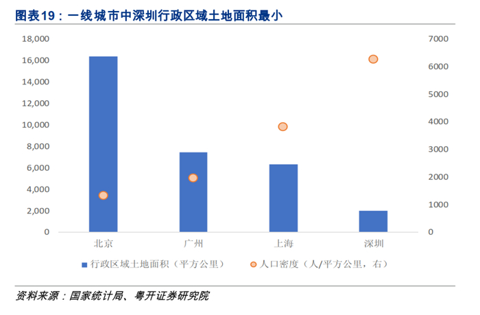 数据显示,深圳城市面积不到2000平方公里,而广州为7434.4平方公里,上海为6340.5平方公里,北京则高达1.6万平方公里。