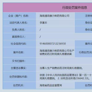 另据海南省食品药品行政处罚案件信息公开网,通用康力主要违法事实为“当事人生产销售劣药注射用奥扎格雷钠”,2021年12月21日被海南药监局行政处罚。