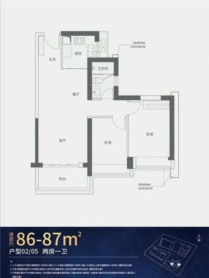 从项目户型图来看,建面约86-87平方米的户型被规划成两室两厅一卫,配备一个大阳台。