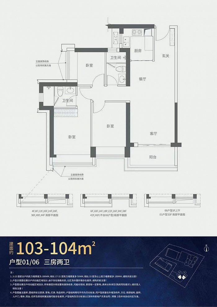 建面约103平方米和建面约105平方米的户型都做成三房,但整体上看厨房面积较小。