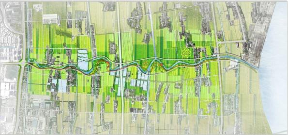 项目位于奉贤西渡街道规划郊野单元内,南起大叶公路,北至黄浦江南岸,沿现状白庙港两侧各新建一条7米路幅的道路。东幅道路全长3.44公里,西幅道路全长3.47公里。该全路段设置两处横向连接通道,作为东西两幅道路的沟通。