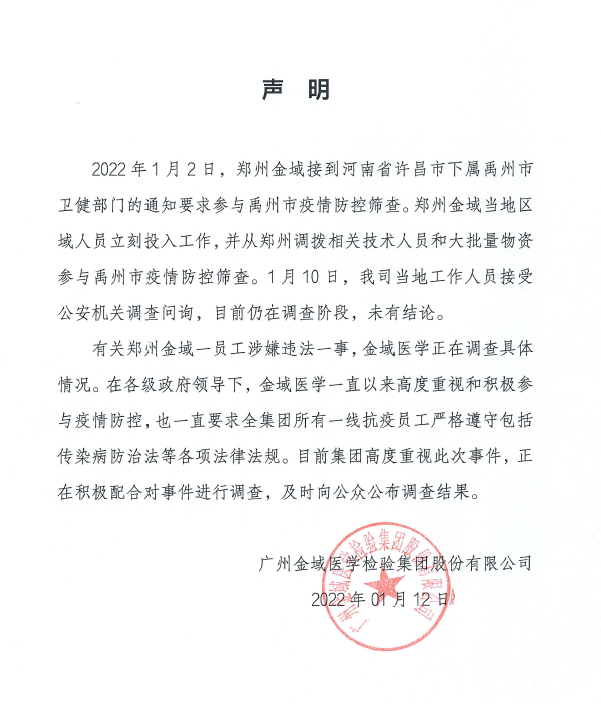 针对警方通报,1月12日午间金域医学声明称,2022年1月2日,郑州金域接到河南省许昌市下属禹州市卫健部门的通知要求参与禹州市疫情防控筛查。郑州金域当地区域人员立刻投入工作,并从郑州调拨相关技术人员和大批量物资参与禹州市疫情防控筛查。1月10日,公司当地工作人员接受公安机关调查问询,目前仍在调查阶段,未有结论。有关郑州金域一员工涉嫌违法一事,金域医学正在调查具体情况。