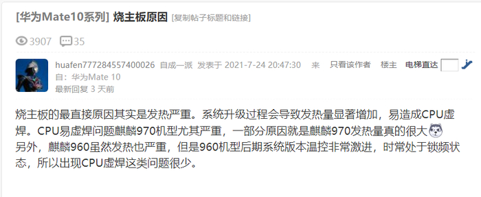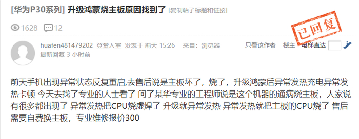 另外,有华为用户在花粉俱乐部发贴表示,升级鸿蒙系统与主板被烧确实有直接关系。系统升级的过程中,导致手机发热量显著增加,异常的发热把CPU烧虚焊了。这一问题在麒麟970机型中尤为严重。