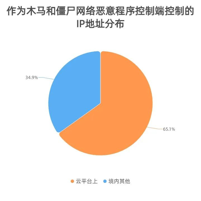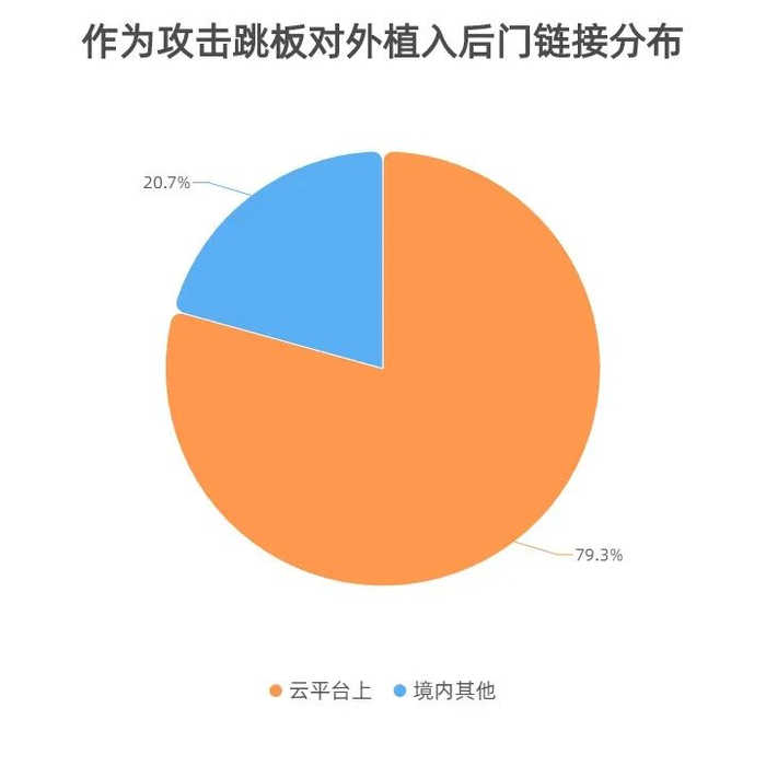 同时,攻击者经常利用我国云平台发起网络攻击,其中云平台作为控制端发起DDoS攻击的事件数量占境内控制发起DDoS攻击的事件数量的51.7%、作为攻击跳板对外植入后门链接数量占境内攻击跳板对外植入后门链接数量的79.3%;作为木马和僵尸网络恶意程序控制端控制的IP地址数量占境内全部数量的65.1%、承载的恶意程序种类数量占境内互联网上承载的恶意程序种类数量的89.5%。