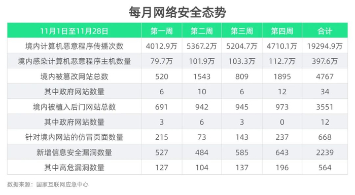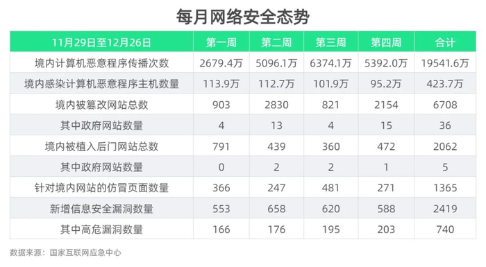 在境内感染计算机恶意程序主机数量上,11月每周呈上升趋势,11月总计397.6万;12月得到控制,每周呈下降趋势总计423.7万。