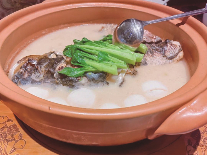 做这道菜,鱼头不可太大,也不可太小。“湘家荡的鱼特别好,没有土腥气,肉质紧实细嫩,而且鱼头部位比一般的花鲢更大,做鱼头汤非常适合。”厨师长李明介绍说。取体量将近鱼身一半的花鲢鱼头,在背鳍前缘至腹鳍后缘下刀平切,去掉黑膜清洗干净后,用猪油将鱼头煎至两面金黄,猪油和鱼头就像是一个完美组合,一下子就激发了鱼头的香味。此时,倒入开水先旺火急烧再改小火慢炖20-30分钟,待汤色尽出后调味,最后下入自制鱼圆和青菜即可。没有任何多余添加,汤色奶白醇厚,浓郁鲜甜,没有丝毫鱼腥味,吃饭之前先喝一碗鱼汤,浓醇鲜香又养胃。