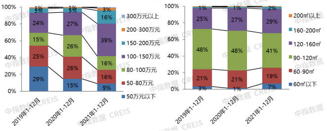 图:2019-2021年保定主城区商品住宅(不含保障房)成交总价结构及成交面积结构情况