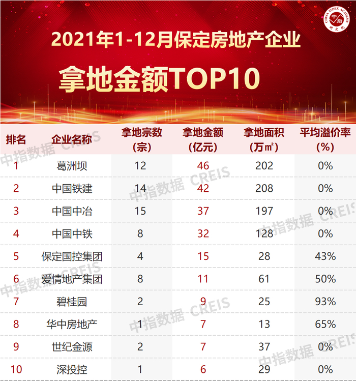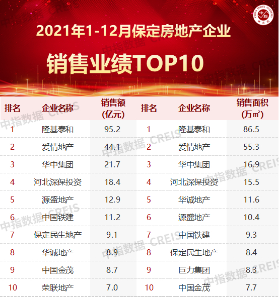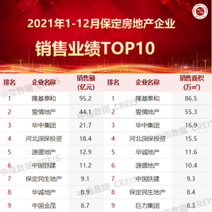 特别声明:房地产企业销售数据统计是以2021年1月1日-12月31日期间销售的商品房为统计口径,包括商品住宅、写字楼、商业、保障房等,主要依据中指数据CREIS(点击试用)在保定市域范围(统计范围:莲池区、竞秀区、满城区、清苑区、徐水区)的销售备案数据项目,并参考当期总体经营情况和推盘去化情况进行分析统计;对于少数没有在监测范围内的企业和项目,由企业提供相关文件,经审核,也纳入统计范围。本报告仅供参考,不对使用报告及其内容所引发的任何直接或间接损失承担责任。