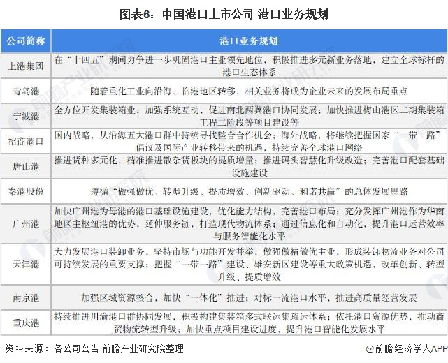 “十四五”开局之年,我国出台多项政策支持港口行业发展,各上市企业也针对港口业务有所规划,规划内容集中在完善港口业务布局,加快港口基础设施建设,提升港口智能化水平;同时把握“一带一路”机遇,加强区域合作与资源整合等方面,具体如下。随着各大港口企业转型升级、提质增效脚步的加快,我国港口行业将迎来新一轮发展。