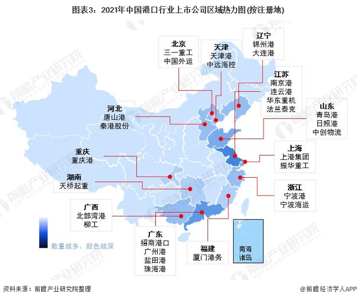 江苏凭借发达的制造业孕育了较多的港口设备制造企业,例如华东重机、法兰泰克等;物流运输上市企业则多位于北京、江苏、上海、浙江等东部经济发达地区。