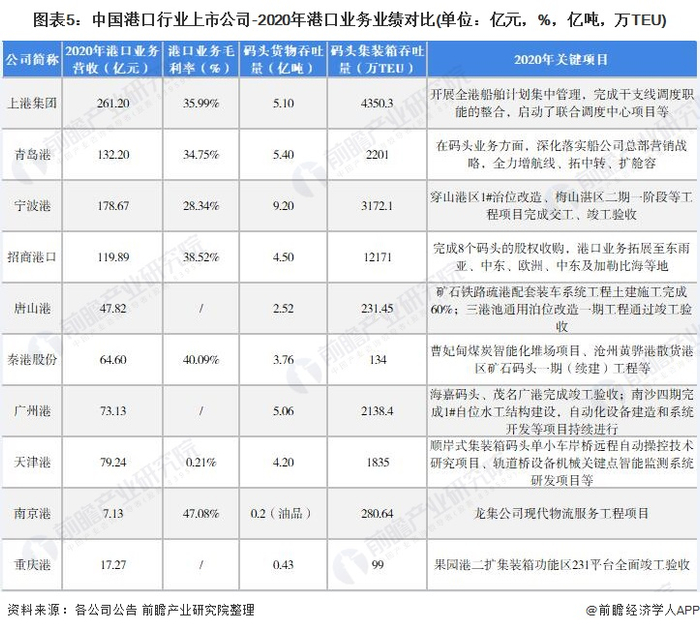 2020年青岛港、宁波港、招商港口等均完成多项港口改扩建项目,进一步扩大业务布局;秦港股份、天津港、广州港、南京港等则大力推进港口智能化、现代化,着力开发现代物流服务工程、智能化堆场、智能检测系统等。
