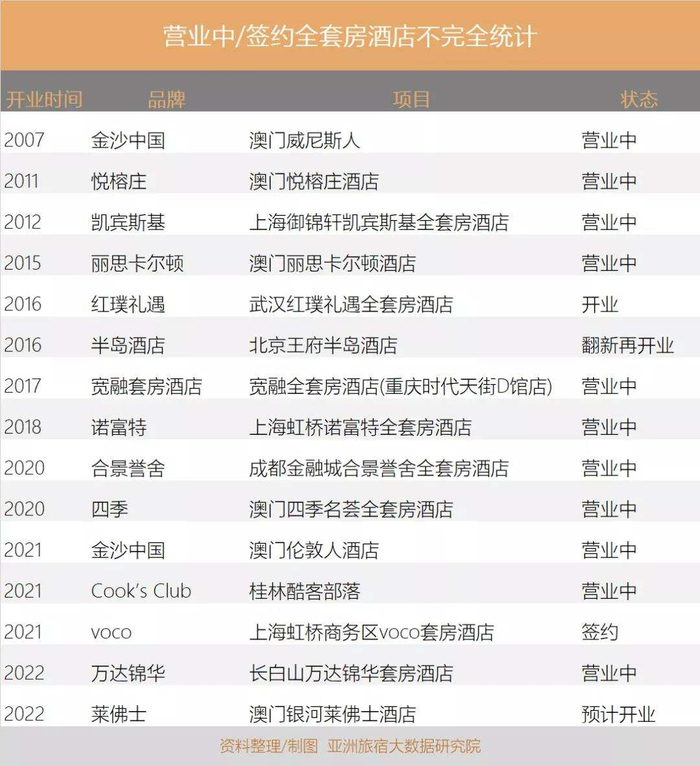 据亚洲旅宿大数据研究院统计,自2002年至2020年,除去已换牌或停业项目,目前仍在营业中的共有8家全套房酒店。换言之,2021年至今新增的4家酒店,已经占据了国内全套房酒店的三分之一。再加上这几家酒店的来头不小,值得更多关注。