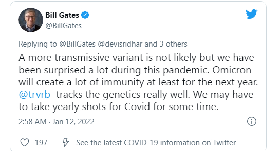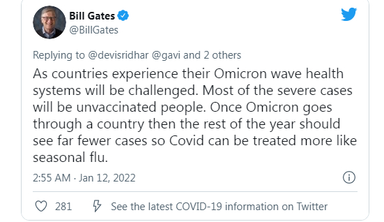 比尔·盖茨谈疫情前景:奥密克戎后不太可能出现传染性更强的变种