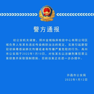 1月12日,河南许昌警方通报称,经公安机关调查,郑州金域临床检验中心有限公司区域负责人张某东违反传染病防治法规定,实施引起新型冠状病毒感染肺炎传播或者有传播严重危险的行为。禹州市公安局于2022年1月10日,对张某东以涉嫌刑事犯罪立案侦查并采取强制措施。