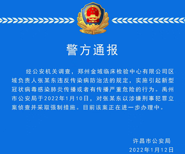中国网财经1月12日讯(记者 苏萌)今日凌晨,河南省许昌市公安局通报,郑州金域临床检验中心有限公司(“郑州金域”)区域负责人张某东违反传染病防治法规定,实施引起新型冠状病毒感染肺炎传播或者有传播严重危险的行为。