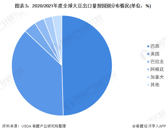 从全球大豆出口情况来看,2020/2021年度,全球大豆出口量为1.65亿吨。其中,巴西大豆出口量为8165.0万吨,占比49.56%;其次为美国,大豆出口量为6165.5万吨,占比37.42%;第三为巴拉圭,出口量为660.0万吨,占比4.01%。
