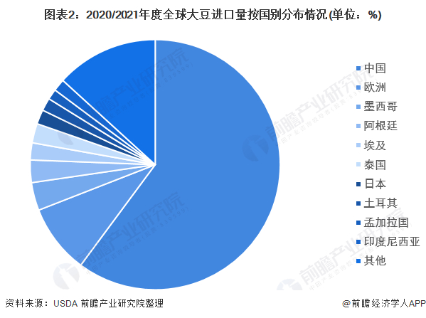 2020/2021年度,全球大豆进口量为1.66亿吨。其中,中国以9976.2万吨排名第一,占总进口量的60.16%;其次为欧洲,进口量为1480.0万吨,占比8.92%;墨西哥排名第三,进口量为600.0万吨,占比3.62。