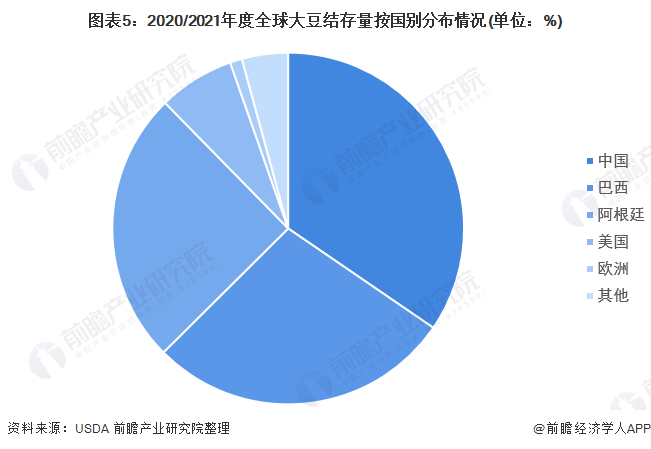 2020/21年度,全球大豆结存量为9980.8万吨。其中,中国、巴西、阿根廷分别占比34.55%、28.00%、25.11%,位列前三。