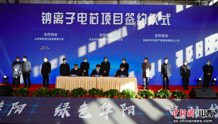 山西新阳清洁能源有限公司、北京中科海钠科技有限责任公司、阳泉市开源资产管理有限责任公司负责人在现场签约。(完)