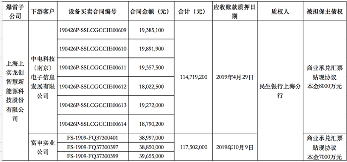 记者查询央行征信中心动产融资统一登记公示平台发现,2019年4月、10月,上实龙创先后有两笔应收账款质押给民生银行上海分行,为累计1.5亿元的商业承兑汇票贴现提供担保。而这两笔应收账款是基于与下游客户中电科技(南京)电子信息发展有限公司、富申实业公司分别签订的设备买卖合同,涉及的合同所产生全部应收账款分别约1.15亿元、1.18亿元。