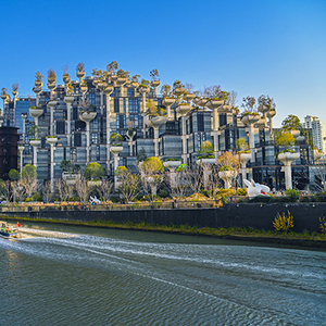 尽管南北两面采用了迥然不同的设计,却又统一在与周边建筑形成强烈反差的、以假乱真的“青山”之中;“青山”的一面真切自然地映衬着弯弯流淌的苏州河,另一面又在莫干山路展现了峻奇险突的雄伟“山势”,由此创造了“拟自然”和“拓文化”的景观。