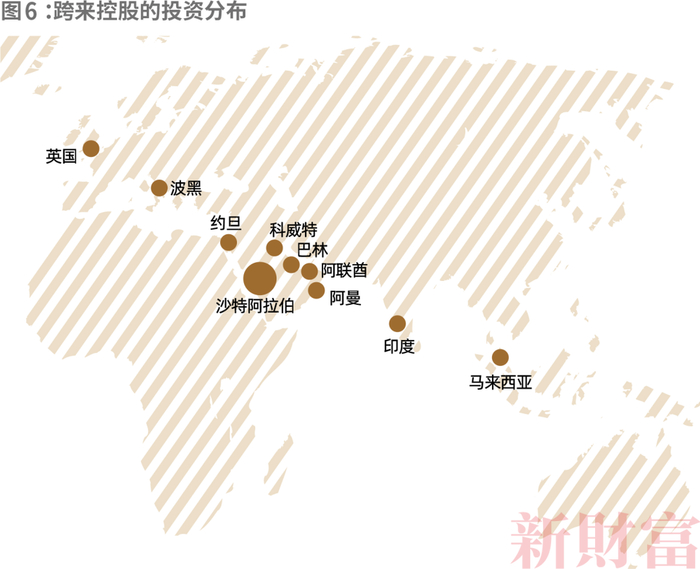 跨来控股已经广泛涉入不同行业,实现了一定程度的分散投资。其业务布局12个国家,在沙特比较少见,而其投资的国际化正是通过家族办公室来实现的。根据德勤2020年中东家族办公室调查,67%的中东家族办公室计划在未来12-18个月内在国际市场进行投资。跨来控股承担战略性资产配置功能,根据资产类别和投资区域精心策划,梳理各项资产的风险特征和成长潜力,其在沙特国外的配置金额约为13亿美元,分布在阿曼、科威特、巴林、印度等地,未来计划增加在英国、卡塔尔和阿联酋等地的投资(图6)。