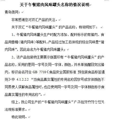 当天下午,信网收到了双汇公共关系中心对于该产品名称及配料表问题的邮件回复。根据双汇方面的解释,这款午餐猪肉风味罐头生产时配方添加、配料标示的有猪肉、食品用香精(猪肉风味)等配料,产品经过加工后体现的综合风味是“猪肉风味”,因此命名为午餐猪肉风味罐头。而该产品包装物主要展示版面印有“午餐猪肉风味罐头”的产品名称,采用的是同一字号及同一字体、颜色,并未单独醒目突出猪肉,标识命名符GB 7718《食品安全国家标准 预包装食品标签通则》中4.1.2.2.2 “当食品真实属性的专用名称因字号或字体颜色不同易使人误解食品属性时,也应使用同一字号及同一字体颜色标示食品真实属性的专用名称”,“综上,我公司生产的‘午餐猪肉风味罐头’产品包装物符合相关法规标准要求。”