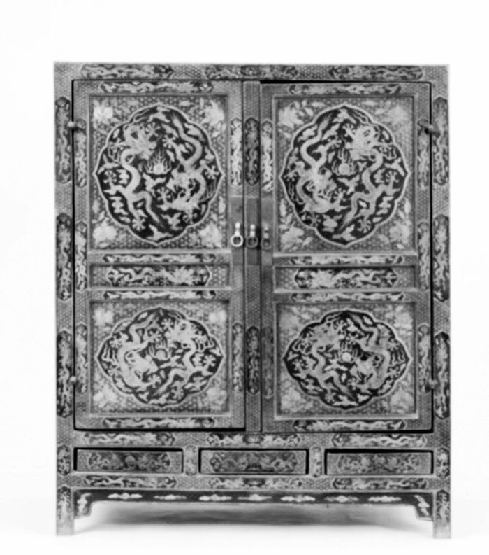在此次展览中,黑漆描金双龙纹药柜外部以龙纹装饰为主,通体黑漆描金,柜门内侧描绘花卉图案。此药柜可以盛放药品达140种,屉面上有涂金名签,标明每种药物名称。此黑漆描金双龙纹药柜对开柜门,柜门下接3个明抽屉。柜内为抽屉架,中心为八方转动式抽屉,上下安架,每面10个,两侧又各有一列10个抽屉。每个抽屉内分3格,盛放不同药物。据了解,本药柜背面有泥金填刻楷书“大明万历年造”6字款。