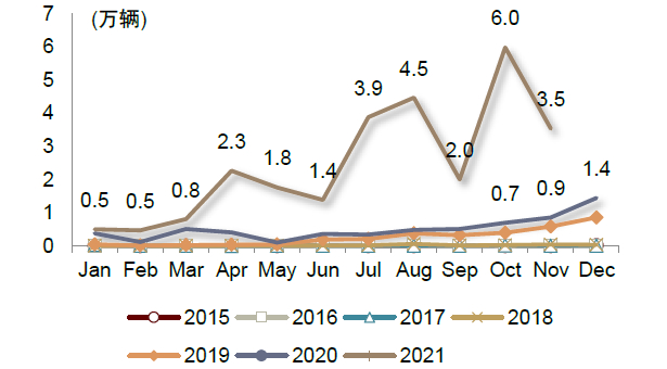 随着全球疫情趋于稳定,2021年中国汽车出口按下加速键,在2020年同期低基数基础上实现翻番。截至2021年11月[1],全年汽车累计出口量达179.3万辆,同比增长1.1倍,我们认为,芯片危机和疫情反复的背景之下,国内汽车产业链的供给优势进一步放大,同时新能源、新市场贡献增量,推动汽车出口走强。