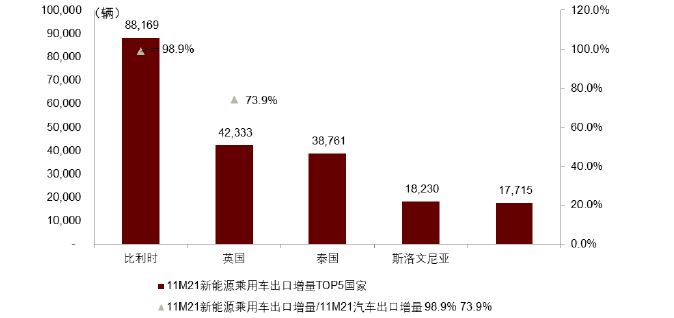新市场:新能源乘用车为欧洲市场突破主力,南美市场出口量再上新台阶。据乘联会数据,2021年1-11月我国对欧洲/南美汽车出口量同比增长234%/179%。同时,汽车出口对欧洲市场的突破主要由新能源乘用车带动,2021年1-11月,中国向比利时、英国的汽车出口量同比增长8.9/5.7万辆,其中新能源乘用车贡献分别为98.9%/73.9%。
