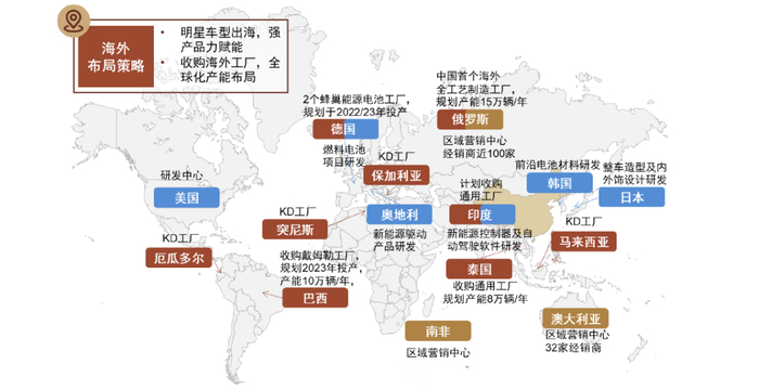 长城:长城已构建以保定总部为核心,以德国、美国、日本、印度、奥地利、韩国为协同的“七国十地”全球研发布局和辐射全球的“13+5” 生产布局,俄罗斯、泰国全工艺制造工厂已实现量产。2021年长城海外销量达14.3万辆,同比增长104%。