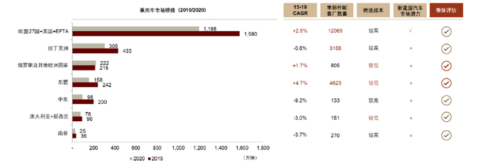 1)市场空间及增速:北美、欧盟27国+英国+EFTA地区乘用车年销量规模超千万台,除澳新、南非以外,其他主要汽车销售市场销量规模均在百万台级别。参考2015-2019年销量增速,东盟地区乘用车市场处于快速成长期;欧洲市场整体保持稳健增长,其中欧盟新成员国2015-2019年乘用车销量CAGR达10.2%;俄罗斯及其他欧洲国家、日本、印度呈现低速增长趋势。