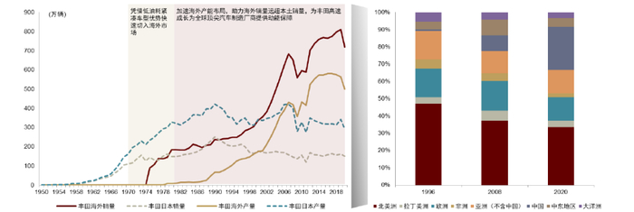1975年至2008年,丰田海外汽车销量自90万辆增长至653万辆,为其业绩增长的核心驱动力,其中北美市场的突破尤为关键。2008年金融危机后,丰田将市场重心转移至亚洲,目前在全球已形成较为均衡的市场结构分布。复盘丰田出海的路径: