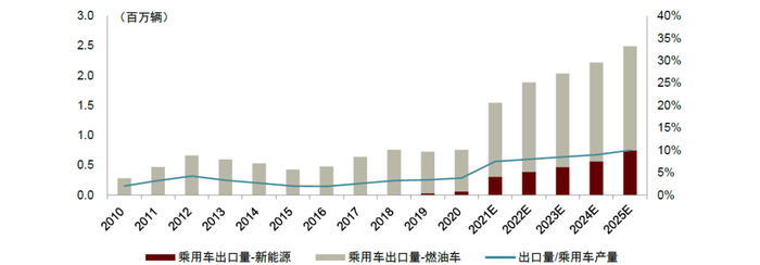 图表25:我们预计中国乘用车出口体量占国内产量比例有望持续提升