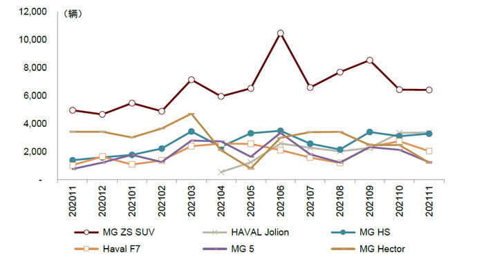 图表12:2021年1-11月海外市场平均月销2000辆左右的自主品牌车型