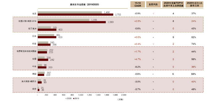 注:1)乘用车市场规模:美国市场含轻卡,韩国含皮卡;中东国家包括巴林、埃及、伊朗、伊拉克、以色列、约旦、科威特、黎巴嫩、阿曼、卡塔尔、沙特、叙利亚、阿联酋;2)2020年销量TOP10品牌中本土品牌数量:数据来源于marklines,“俄罗斯及其他欧洲国家”仅统计俄罗斯;“东盟”仅统计泰国、越南、马来西亚、菲律宾、印度尼西亚、新加坡、缅甸、老挝8国;中东仅统计伊朗、以色列、沙特阿拉伯、阿拉伯酋长国、科威特、埃及、阿曼7国;北美、拉丁美洲、俄罗斯含轻卡销量;3)OICA与Marklines数据口径有差异