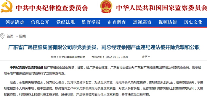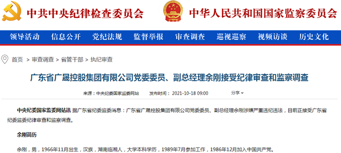 此前,据中央纪委国家监委网站2021年10月18日消息,时任广东省广晟控股集团有限公司党委委员、副总经理余刚接受纪律审查和监察调查。