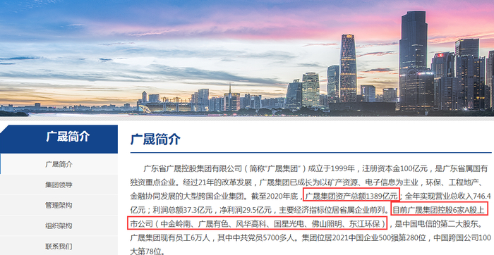 广东省广晟控股集团有限公司官网信息显示,广东省广晟控股集团有限公司(简称“广晟集团”)成立于1999年,注册资本金100亿元,是广东省属国有独资重点企业。经过21年的改革发展,广晟集团已成长为以矿产资源、电子信息为主业,环保、工程地产、金融协同发展的大型跨国企业集团。