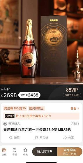 中国经济周刊—经济网讯 近日,青岛啤酒发布了超高端啤酒“一世传奇”,电商平台显示该款啤酒2瓶1.5L的售价为2698元。此前,百威啤酒也加入到千元级啤酒的竞争中,一款名为“大师传奇”798ml虎年限量版啤酒,每瓶售价高达1588元。