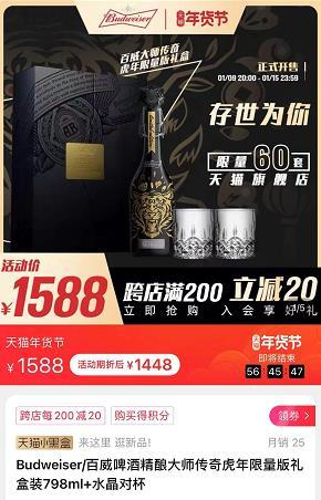 除了青岛啤酒之外,百威啤酒也加入到千元级啤酒的竞争中,其最近在电商平台上线了一款名为百威“大师传奇”798ml虎年限量版啤酒,售价高达1588元/瓶,甚至超过了飞天茅台的定价。