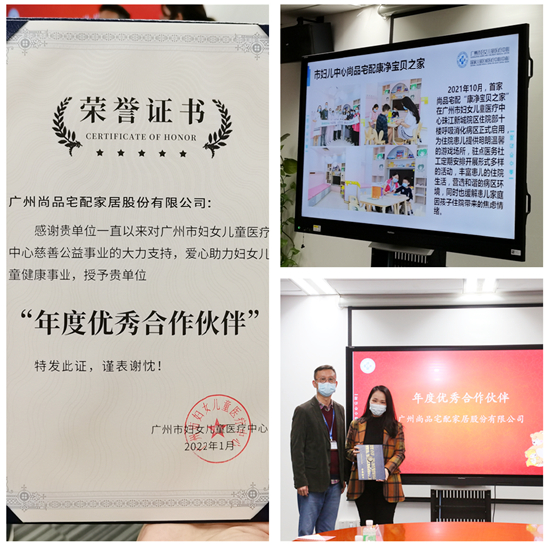 专注孩子的健康成长,尚品宅配矢志不渝助力教育公益的同时,也在医疗公益领域实现了突破与创新,并斩获荣誉。“康净守护计划”首站“康净宝贝之家”落户的广州市妇女儿童医疗中心于1月12日下午举办了“公益路上 有你同行”2021年度表彰交流活动,尚品宅配获得医院颁发唯一“年度优秀合作伙伴”称号。