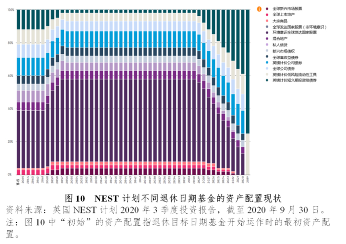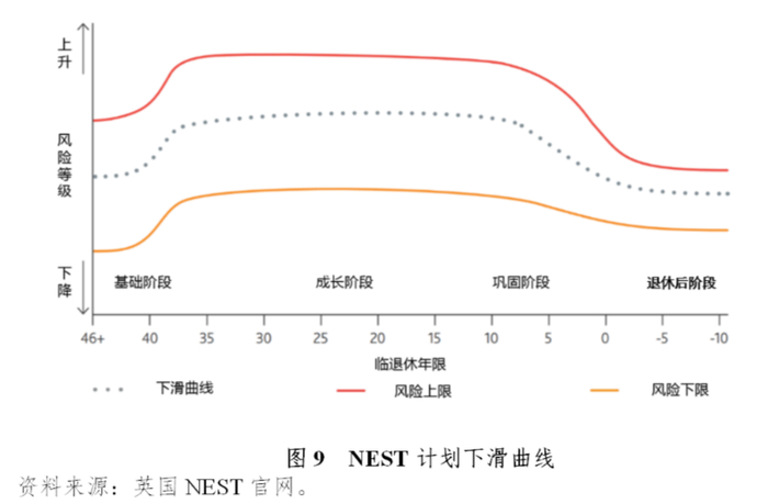 退休日期基金的投资策略与美国的目标日期基金具有相似之处,通过构建下滑曲线来实现高风险资产与低风险资产之间的比例配置。不同的是,NEST计划的退休日期基金在时间上又细分为基础、成长、巩固和退休后四个阶段,每个阶段具有不同的投资目标与风险控制约束,以求更好地为NEST计划参与人获取长期且充分的投资收益,最大限度提升参与人的退休收入保障。此外,退休日期基金按照年度频率设置了以不同退休日期为目标的子基金,截至2020年3月底,NEST计划下共设有50只退休日期基金,目标退休日期从2019年覆盖至2066年,有将近99%的计划参与个人选择投资于退休日期基金,有超过97%的计划资产配置于退休日期基金之中。